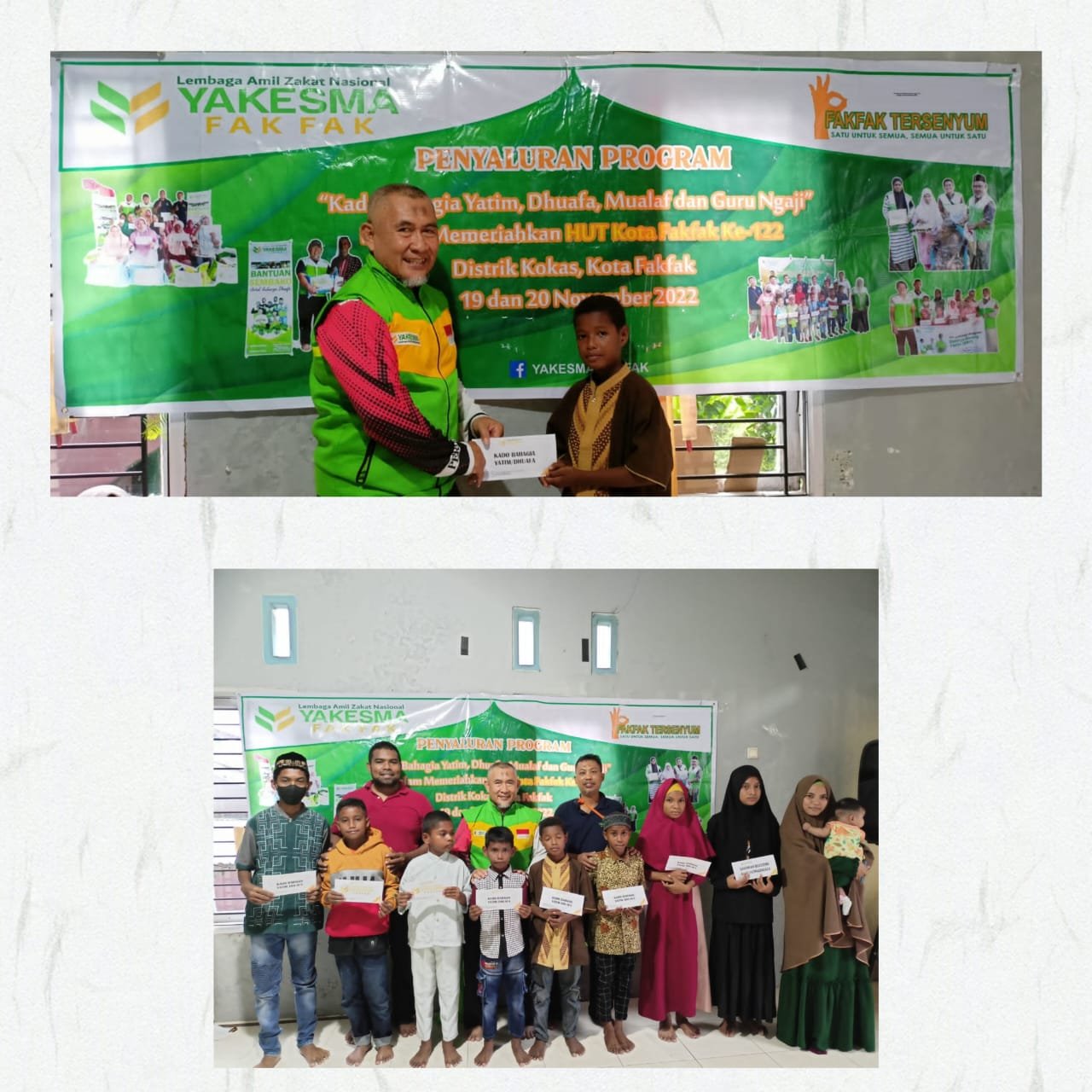 Penyaluran kado Bahagia kali ini dipimpin langsung oleh Kepala Kantor Layanan Yakesma Fakfak. Dalam sambutannya dalam penyaluran program ini, Bapak Hariyono selaku pimpinan Yakesma Fakfak menyampaikan bahwa gerakan kepedulian  ini dibuat agar kita saling tolong menolong dan berbagi bahagia dalam momen-momen Bahagia.
